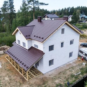 • Европейская. Материал имитирует деревянную крышу (фактура, цвет). Подойдет для покрытия кровель в европейском стиле.